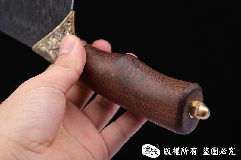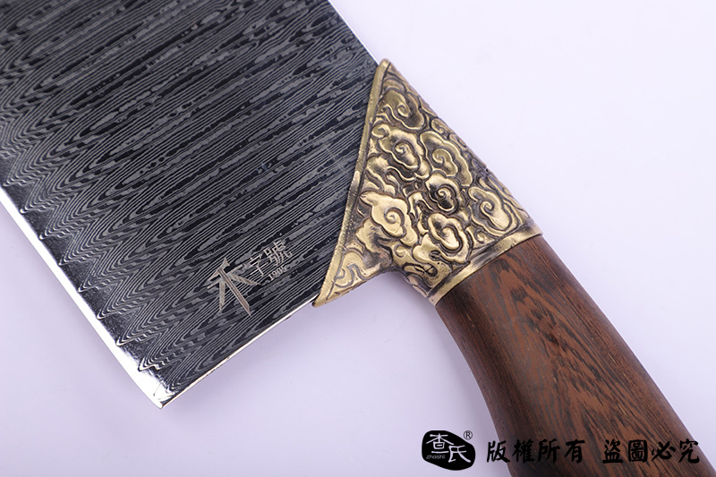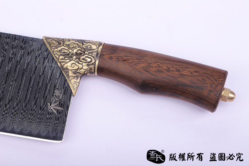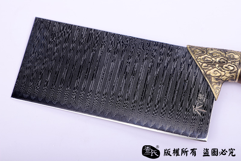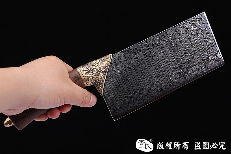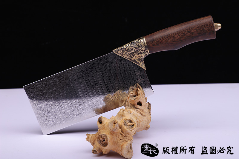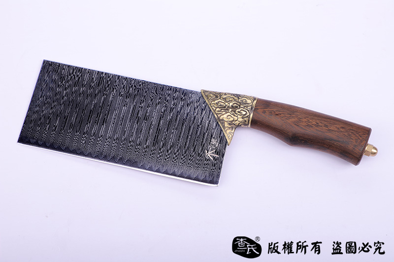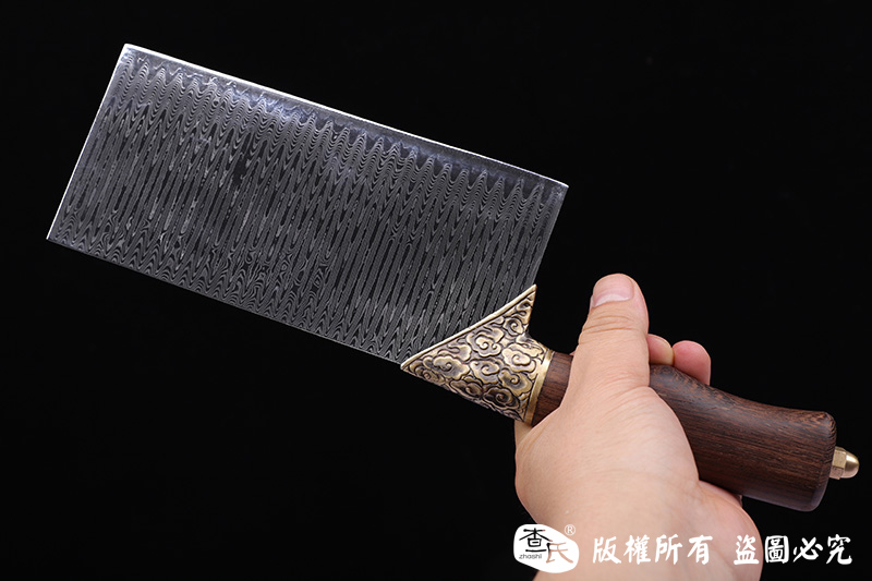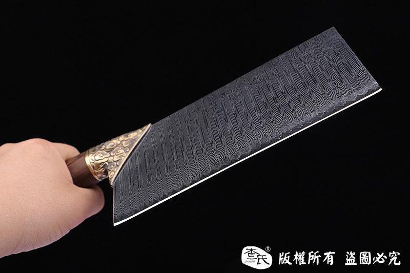 【作品简介】 本店商品均实物拍摄,细节清晰,可仔细比较。 【作品规格】 全长:31cm左右,柄长:12.3cm,刃长:18.2cm,刃宽:8.3cm,刃厚:0.2cm,重量:0.35kg左右。 【刃材工艺】 手工大马士革钢夹vg10 【作品装具】 铜装具 【作品柄材】 鸡翅木手柄 【作品赠品】 锦盒 【其他事项】 手工产品,重量尺寸稍有误差,请以实物为准