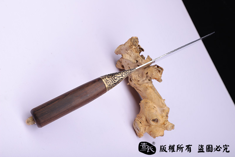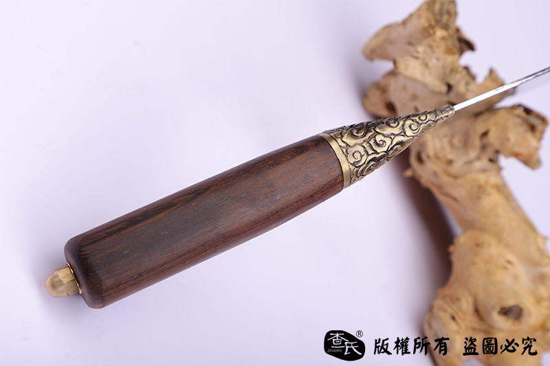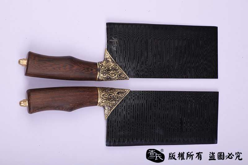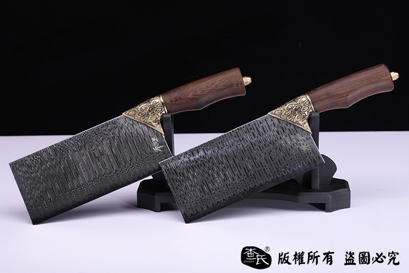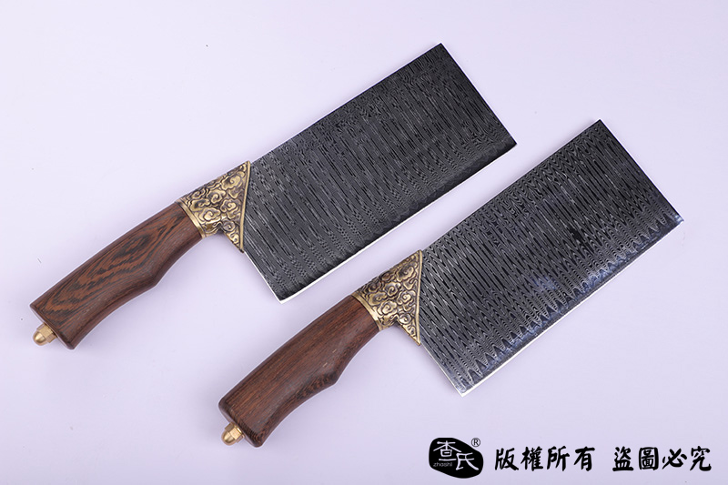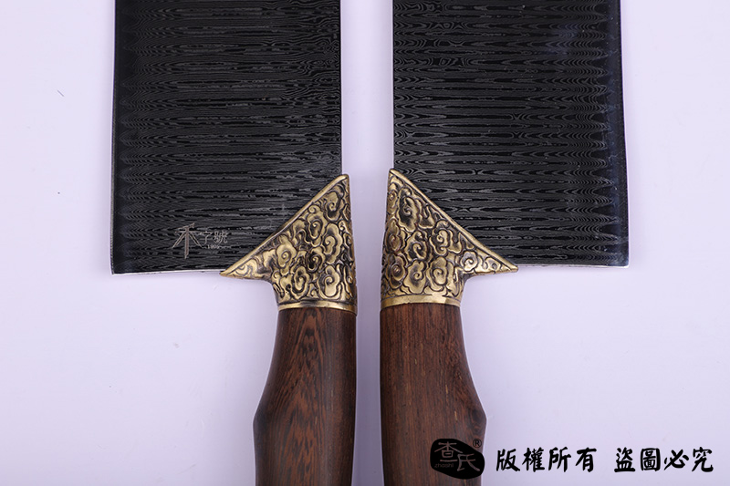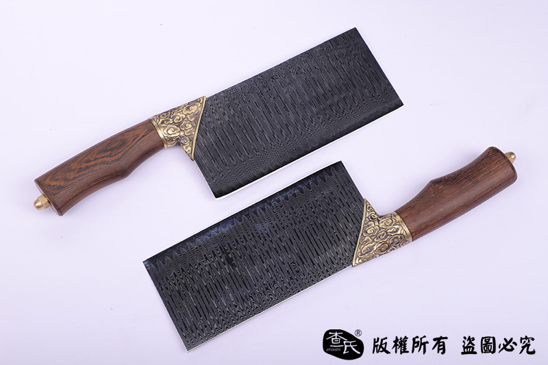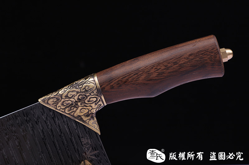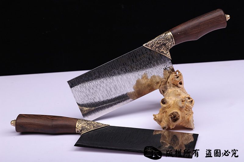 【作品简介】 本店商品均实物拍摄,细节清晰,可仔细比较。 【作品规格】 全长:31cm左右,柄长:12.3cm,刃长:18.2cm,刃宽:8.3cm,刃厚:0.2cm,重量:0.35kg左右。 【刃材工艺】 手工大马士革钢夹vg10 【作品装具】 铜装具 【作品柄材】 鸡翅木手柄 【作品赠品】 锦盒 【其他事项】 手工产品,重量尺寸稍有误差,请以实物为准